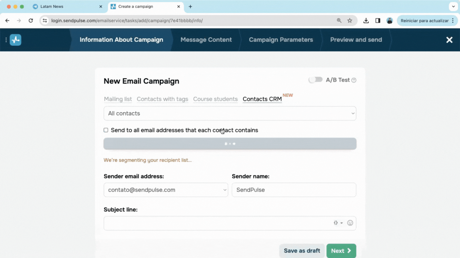 ¿Pensaste que este mes no había Newsletter Técnico? En SendPulse trabajamos todos los días para actualizar nuestra plataforma y hacer tus procesos más fáciles. Así que, claro que te tenemos nuevas mejoras. Presta mucha atención y ¡comencemos! Enviar campañas a tus contactos de CRMAhora, tenemos una opción para enviar campañas de email marketing a los contactos de tu CRM o a los estudiantes de tu curso. Con esta nueva actualización podrás reducir tiempos y estar en contacto con tus clientes potenciales. |