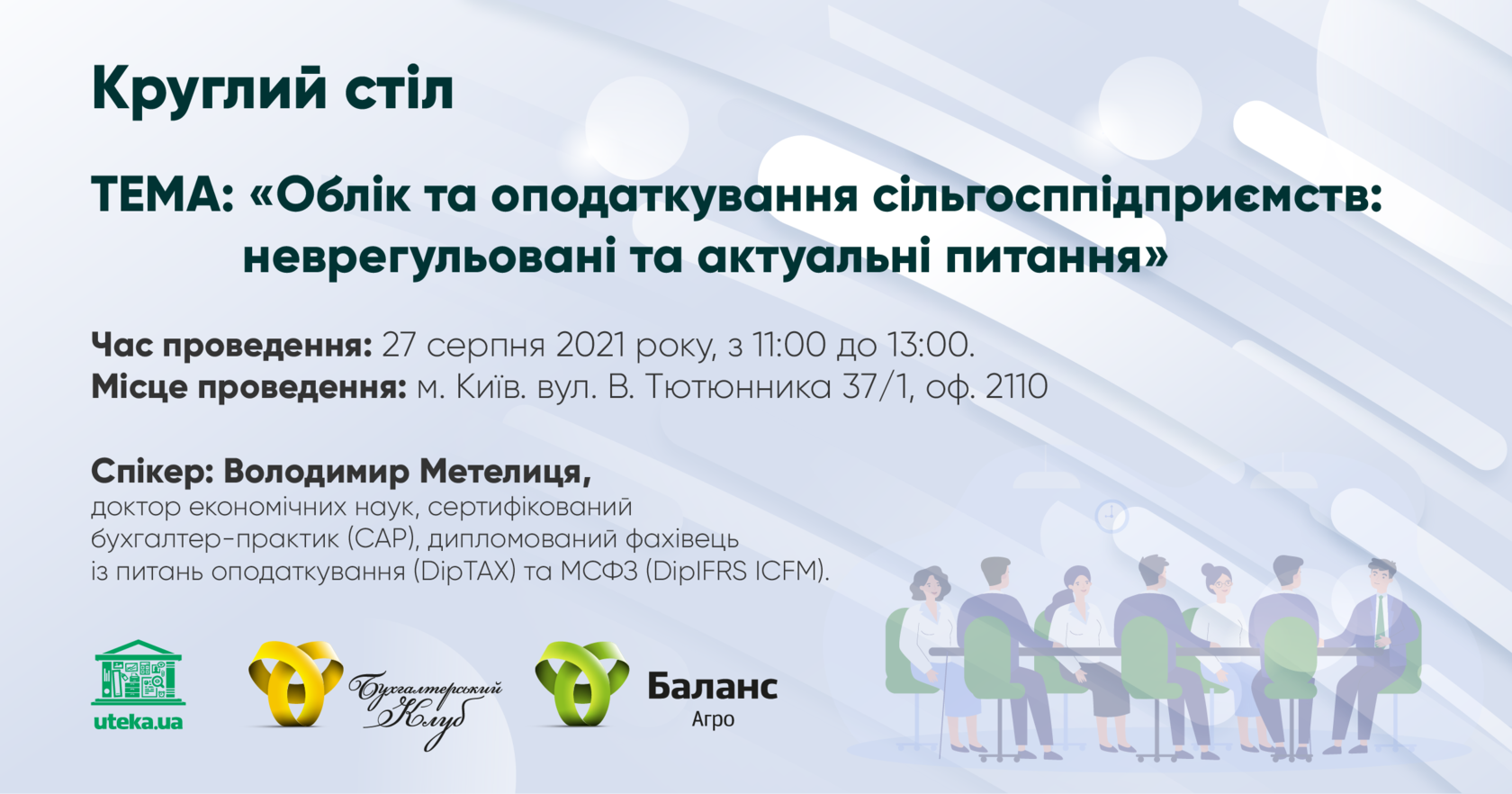 «Облік та оподаткування сільгосппідприємств: неврегульовані та актуальні питання», який відбудеться 27 серпня 2021 року з 11:00 до 13:00.