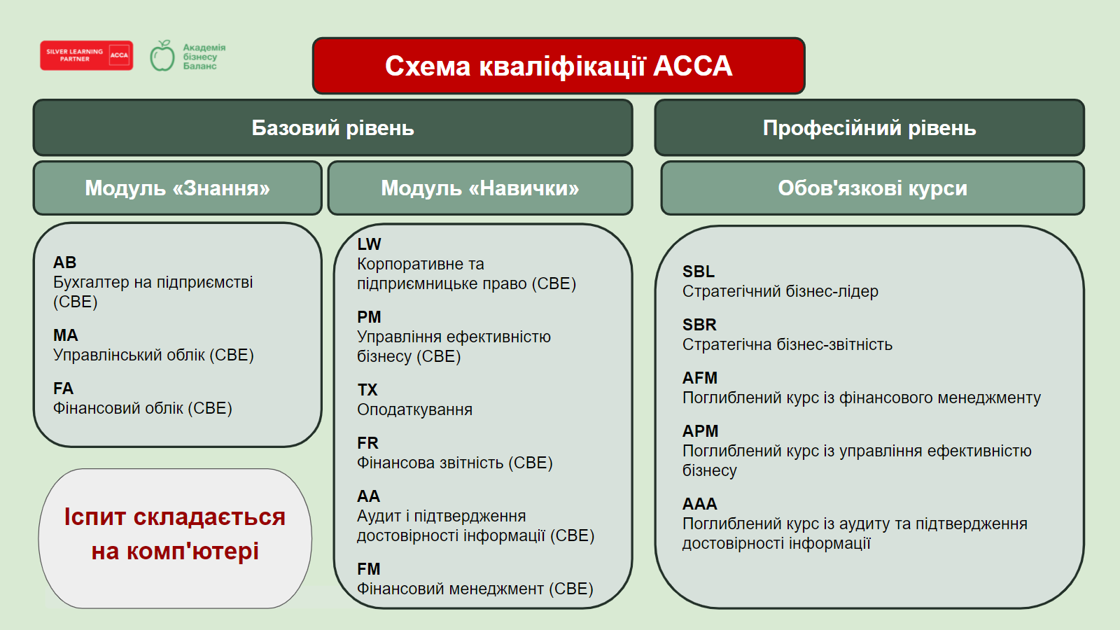 Усі необхідні знання дає кваліфікація АССА ДипІФР зі здобуттям диплома ДипІФР. Пройти підготовку можна лише двічі на рік: з березня до травня і з вересня до листопада. Іспити проходитимуть у першій декаді червня і грудня 2022 року.