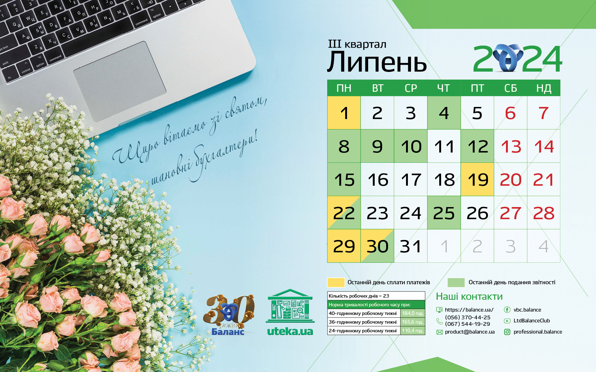 Для того, щоб допомогти бізнесу та бухгалтерам Uteka нагадує строки для звітування та сплатити податків в найкориснішій шпаргалці – Календар бухгалтера на місяць. Дізнайтеся про всі дати, коли потрібно подати фінансову, податкову, статистичну звітність та сплатити зобов’язання в липні 2024 року. В календарі ви також знайдете необхідні форми звітності та актуальні консультації фахівців. Все для того, щоб вам було зручно! Нагадуємо, що у липні бухгалтери відзначатимуть своє професійне свято, тож прийміть нашу вдячність за вашу працю у цих непростих умовах. |