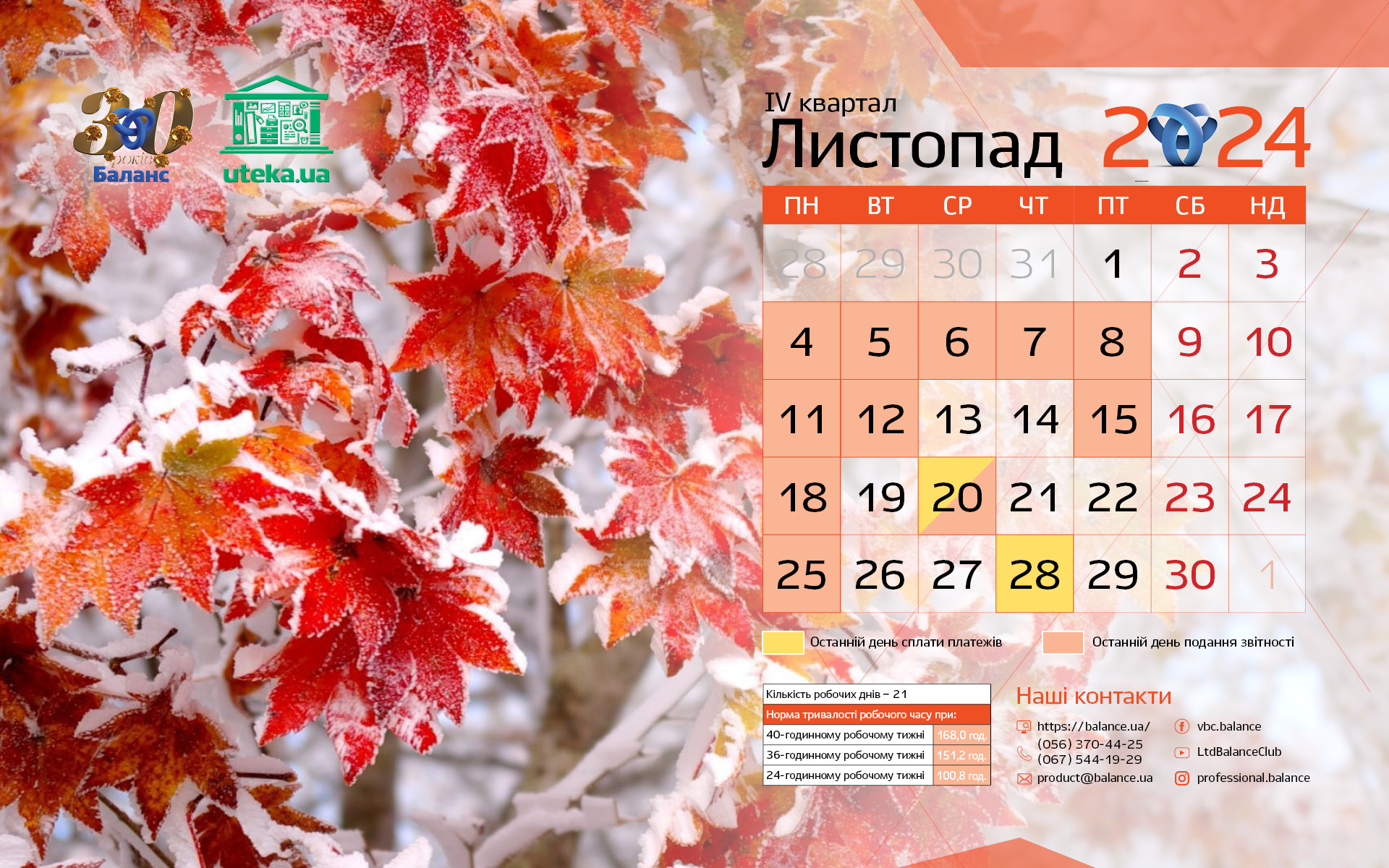 В ньому є всі дати, коли потрібно подати фінансову, податкову, статистичну звітність та сплатити податки в листопаді 2024 року. В календарі ви також знайдете необхідні форми звітності та актуальні консультації фахівців.