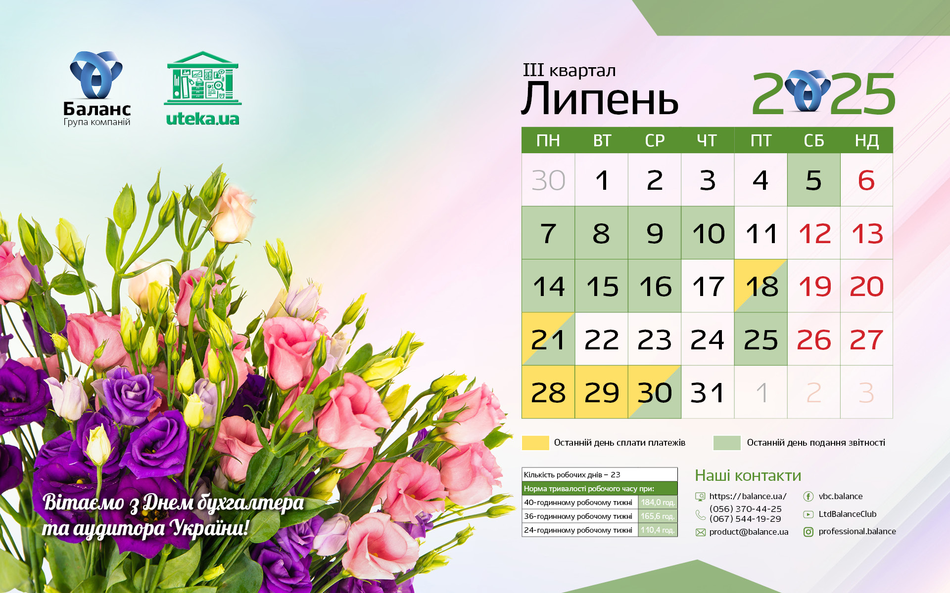 Дізнайтеся про всі дати, коли потрібно подати фінансову, податкову, статистичну звітність та сплатити зобов’язання в липні 2025 року. В календарі ви також знайдете необхідні форми звітності та актуальні консультації фахівців. Все для того, щоб вам було зручно!
