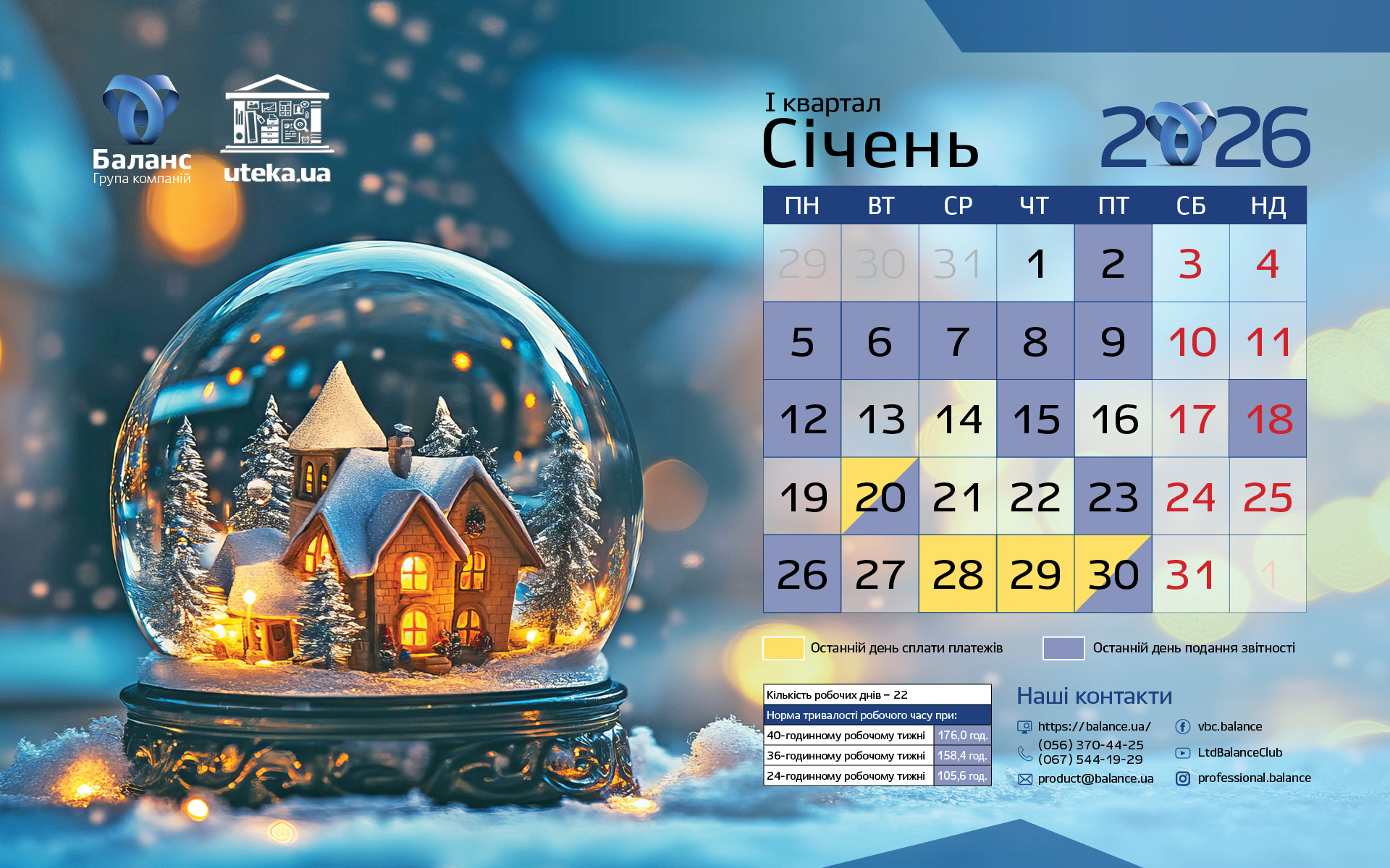 У ньому зібрані всі ключові дати подання фінансової, податкової та статистичної звітності, а також строки сплати податків у січні 2026 року. Плюс — потрібні форми звітів і актуальні консультації експертів. Коротко: все, щоб було зручно, зрозуміло і без зайвого стресу.