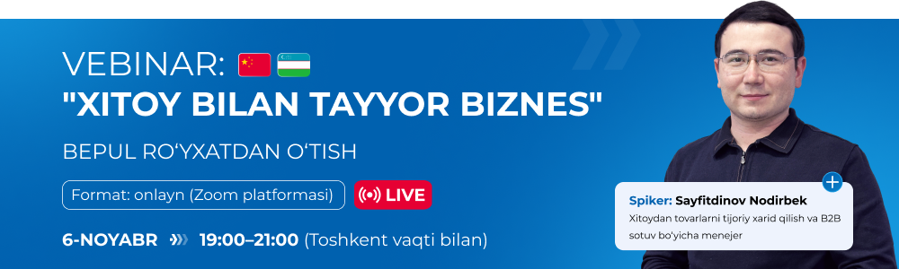 Spiker: Nodirbek Saifitdinov, Xitoydan B2B savdo va tijorat xaridlari menejeri. 📅 Qachon: 2025-yil 6-noyabr, soat 19:00 - 21:00 📍 Formati: Onlayn, Zoom platformasi Taqdimot tili: O'zbekcha 👉🏻 Ro'yxatdan o'tgandan so'ng, siz Zoom vebinariga shaxsiy havola olasiz. 👉🏻 Keraksiz xavf va qiyinchiliklarsiz ko'proq pul ishlashingizga qanday yordam berishimizni bilish uchun ro'yxatdan o'ting. |