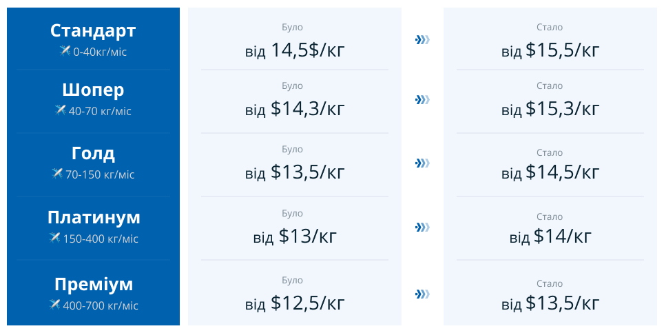 Шановні клієнти! 💙 Повідомляємо, що у зв’язку із підвищенням цін міжнародними авіаперевізниками ми також мусимо скоригувати свої тарифи на авіадоставку з Китаю до України поштових посилок вартістю до 150 євро включно та/або вагою до 30 кг. Підвищення авіапослуг відбулось раніше, але ми певний час намагались втримати тарифи та шукати альтернативи, бо для нас важливо, щоб доставка була не лише швидкою, а й доступною. Втім, зараз ми опинилися на тому етапі, коли без коригування вже ніяк. 📌 Від 17 листопада 2025 року вартість авіадоставки поштових посилок зросте на +1 $/кг. |