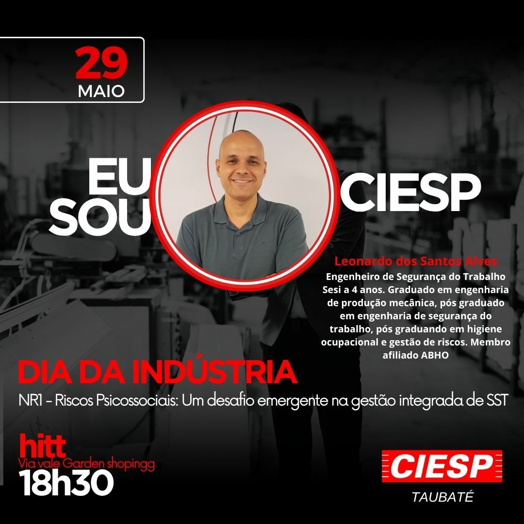 É dia 29 de maio (quinta-feira), às 18h30! Além de olhar para o desenvolvimento local e o setor industrial regional, a noite também contará com uma palestra de Leonardo dos Santos Alves, Engenheiro de Segurança do Trabalho SESI e membro da ABOH, sobre NR1 - Riscos Psicossociais: Um desafio emergente na gestão integrada de SST.